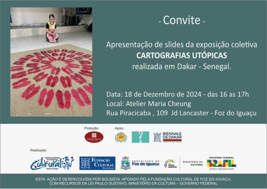 Convidamos a todos para uma apresentação de slides. É o resultado da participação na OFF, evento paralelo ao 15ª Bienal de Arte Contemporânea de Dakar em Senegal. Será nesta quarta feira, dia 18/12/24 das 16 as 17h. Rua Piracicaba, 109 – Jd Lancaster – Foz do Iguaçu.