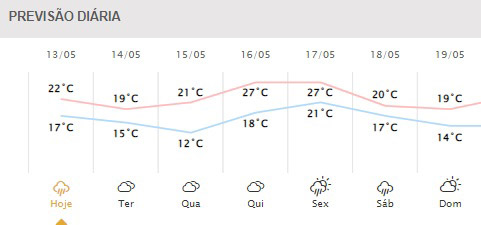 O boletim da Metsul Meteorologia, por sua vez, trabalha com mínimas de 10°C para terça, 8°C para quarta, 14°C para quinta, 16°C para sexta, 11°C para sábado e 9°C para domingo (19). A máxima no período não deverá passar dos 25°C.