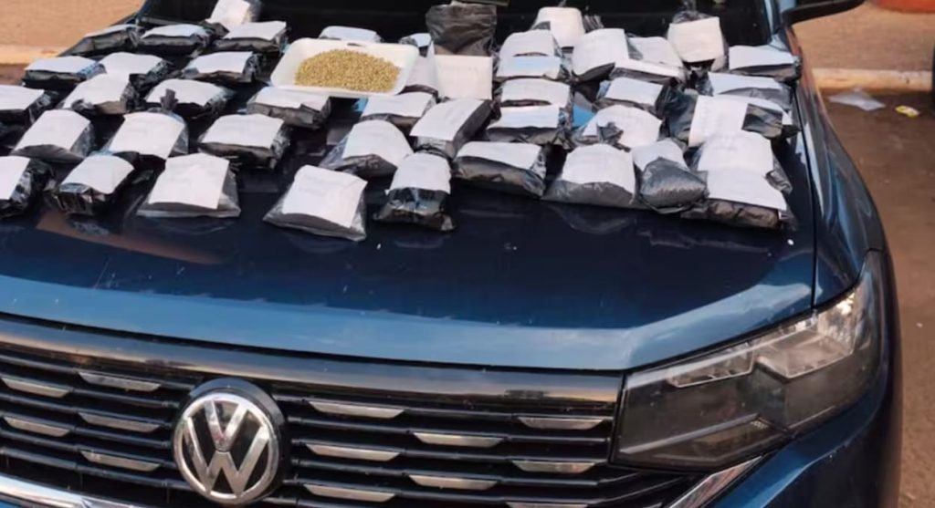 Em fundos falsos no motor e no interior do automóvel, foram encontradas 50 bolsas plásticas contendo itens proibidos na Argentina.