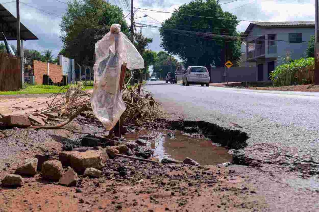 Parece ter virado moda em Foz do Iguaçu. Um buraco foi sinalizado para alertar motoristas que usam a Rua Francisco Fogaça, na região do Jardim São Roque. O problema da pista danificada é recorrente, relata a comunidade.