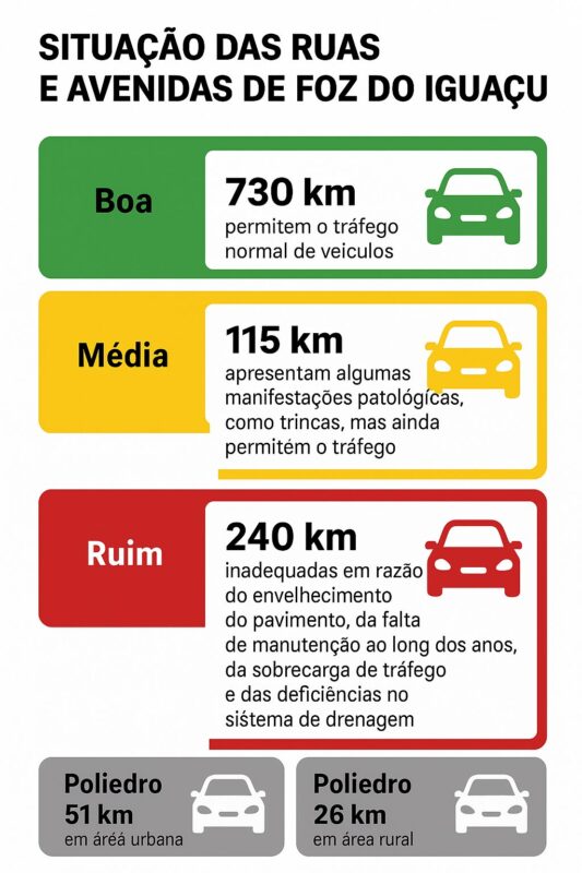 A Secretaria Municipal de Obras concluiu um levantamento técnico detalhado de toda a malha viária de Foz do Iguaçu. A prefeitura constatou o que motoristas sentem na prática no dia a dia: 240 quilômetros de ruas e avenidas em Foz do Iguaçu são considerados “ruins” para transitar.