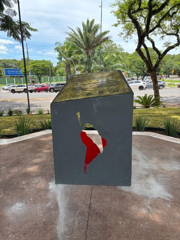 O Monumento à Democracia na América Latina foi recolocado na Praça Naipi nessa terça-feira, 16. A Prefeitura de Foz do Iguaçu havia retirado a peça do local sob a justificativa de estar revitalizando o espaço.