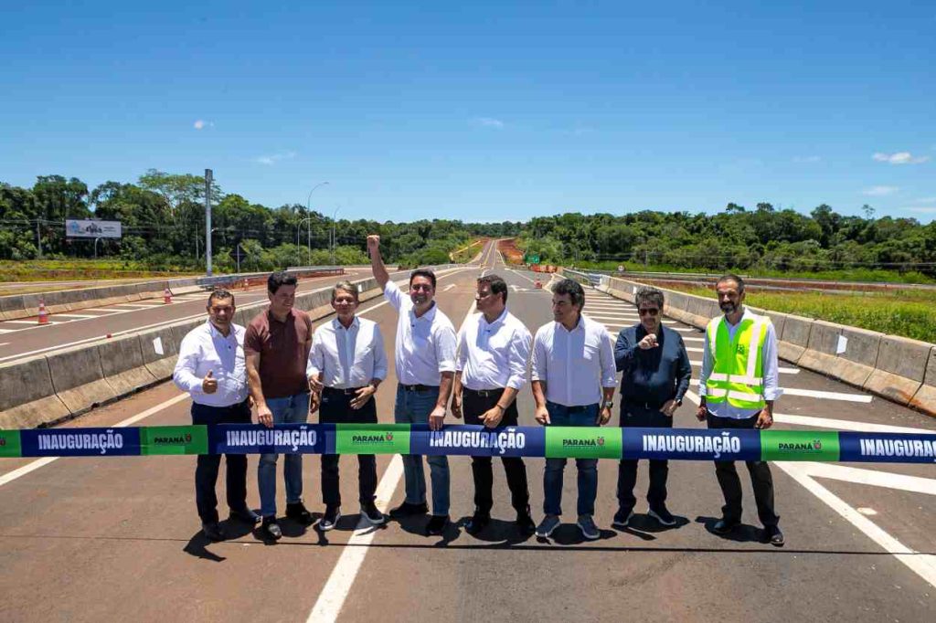 O governador Carlos Massa Ratinho Junior (PSD) entregou a obra Perimetral Leste de Foz do Iguaçu e anunciou a liberação da rodovia para o fluxo de veículos, em evento nesta quinta-feira, 11. Ele também fez vistoria técnica nas novas aduanas junto à Ponte Internacional da Integração Brasil–Paraguai.