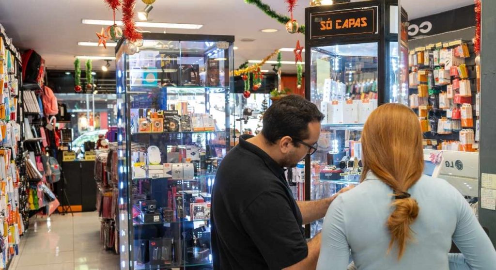 “Quando o cliente encontra algum problema com a película ou carregador, por exemplo, estamos aqui para resolver de imediato. Somente em alguns casos, como relógios, celulares ou fones de ouvido, precisamos realizar um teste para validar a troca”, complementa o líder de loja.