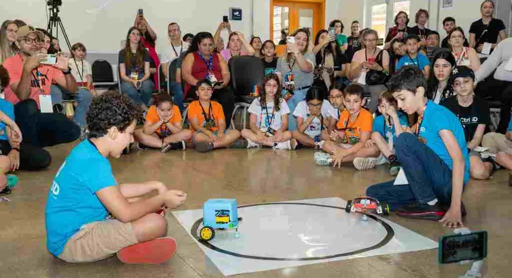 Uma das atrações da área de robótica envolvendo crianças e jovens foi o Sumô de Robôs, uma disputa que envolve robôs em uma pista.