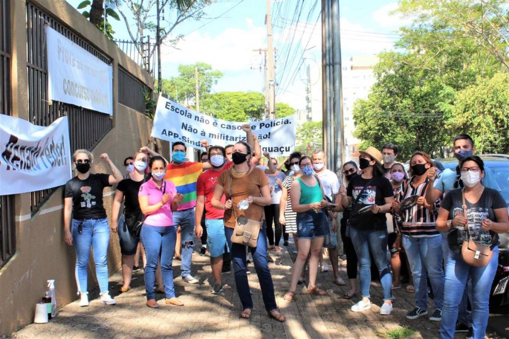 Professores e funcionários da rede estadual de educação protestaram, no Núcleo Regional de Educação de Foz do Iguaçu (NRE), nesta quinta-feira, 19. Foi a quarta mobilização, em três semanas, na frente do órgão que representa localmente a Secretaria de Estado da Educação.