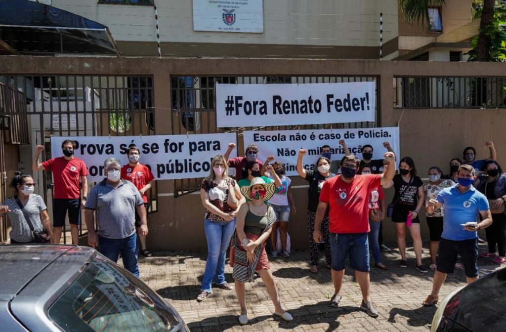Professores e funcionários de escolas protestaram em frente ao Núcleo Regional de Educação de Foz do Iguaçu (NRE) nesta terça-feira, 17. A mobilização fez parte da agenda estadual, com atos públicos em várias cidades paranaenses, em defesa da educação pública.