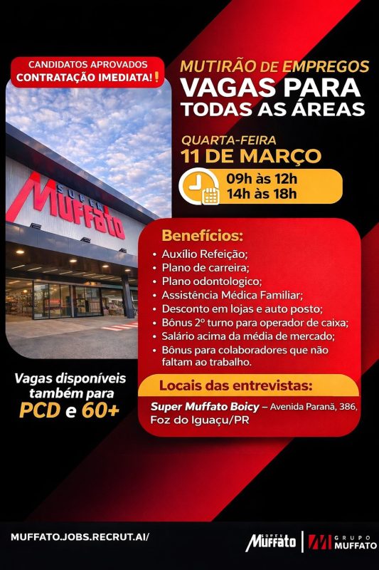 O Grupo Muffato promoverá mutirão de empregos para contratação imediata em Foz do Iguaçu nesta quarta-feira, 11. A seleção será feita pela unidade Boicy, na Avenida Paraná, 386.
