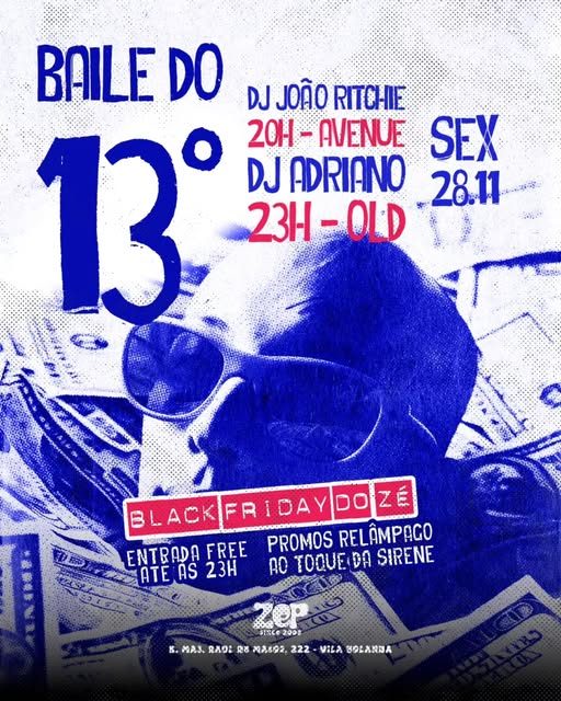 Bora curtir um baile delícia no ZEP! A festa começa cedo no Avenue, com João Ritchie nas pick-ups. Na sequência, um Flashback de respeito com DJ Adriano, trazendo o melhor das pistas.