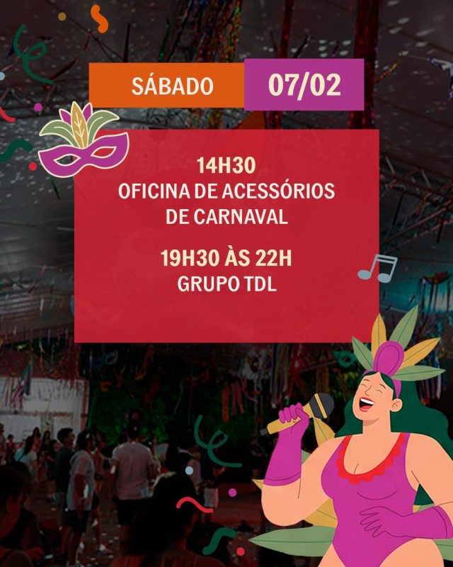 A programação do dia 7 contará com: Oficina de acessórios de carnaval e show com o Grupo TDL.