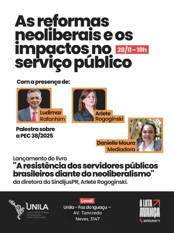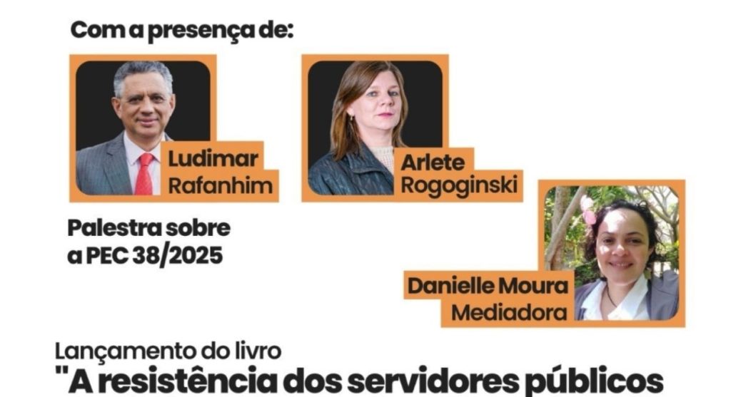 O evento contará com a palestra do Dr. Ludimar, que abordará a PEC 38/2025, além do lançamento do livro da diretora do SindijusPR Arlete Rogoginski “A resistência dos Servidores Públicos brasileiros diante do neoliberalismo: Estudo de caso da campanha de comunicação digital ‘Movimento a serviço do Brasil’ contra a PEC 32/2020”.