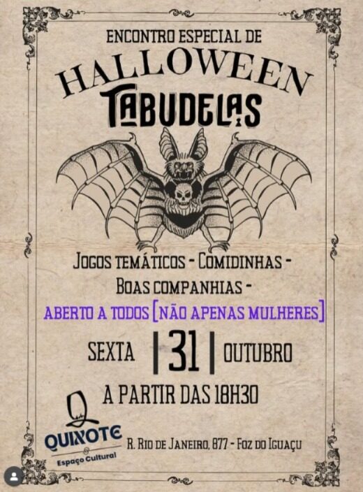 Sexta, dia 31 de outubro, o TabuDelas convoca todas as criaturas da noite pra uma jogatina de arrepiar no Quixote Espaço Cultural.