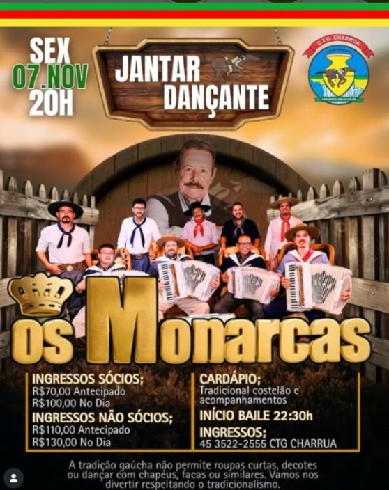 Grande jantar dançante no CTG Charrua. A tradição gaúcha não permite roupas curtas, decotes ou dançar com chapéus ou similares. Vamos nos divertir respeitando tradicionalismo.