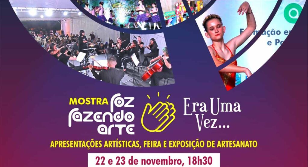 Nos dias 22 e 23 de novembro, a Estação Cultural João Sampaio, localizada na Rua N, nº 56, na Vila C Nova, será palco da Mostra Foz Fazendo Arte, evento que promete encantar o público com o tema “Era Uma Vez”. A programação cultural, que começa às 18h30, contará com apresentações artísticas, uma feira e uma exposição de artesanato, todas realizadas por arte-educadores e educandos do programa.