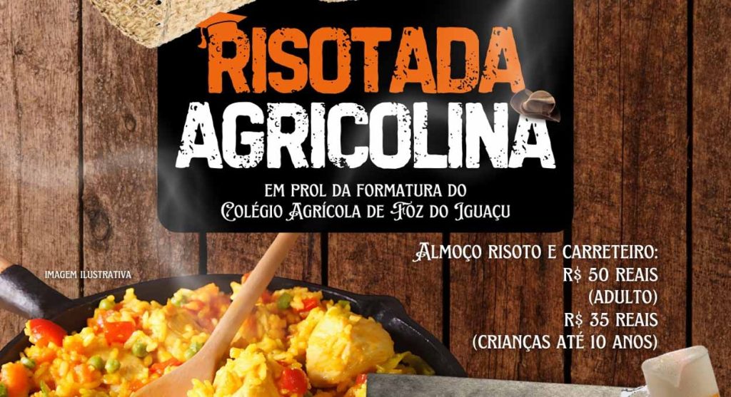 O evento será em prol da Formatura do Colégio Agrícola de Foz do Iguaçu, o valor é de R$ 50,00 reais adultos e R$ 35,00 reais crianças de até 10 anos. Será servido Risoto e Carreteiro.