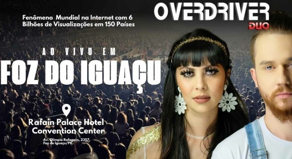 A revolução musical Overdriver Duo, liderada por Evandro Tiburski e Fabi Terada, desembarca com a sua nova turnê mundial pela primeira vez em Foz do Iguaçu/PR, no dia 09 de agosto de 2024, sábado, às 21h00, no Rafain Palace Hotel & Convention. Na turnê que já passou por 15 países e 3 continentes, o casal apresenta um espetáculo de performance eletrizante que mescla os elementos do pop, do rock e do eletrônico passando por vários hits nacionais e internacionais dos anos 80, 90 e atuais, contagiando casais apaixonados, crianças, adultos e toda a família.