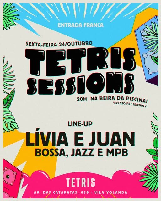 Essa sexta (24/10), o Tetris Sessions toma conta da beira da piscina com o som delicioso de Lívia e Juan, mandando o melhor da Bossa, Jazz e MPB.