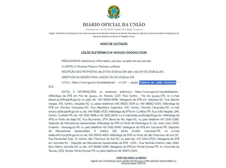 O leilão reúne mercadorias armazenadas em diferentes depósitos da Receita Federal na Região Sul e representa uma oportunidade para aquisição de bens com valores competitivos, respeitando as regras estabelecidas no processo.