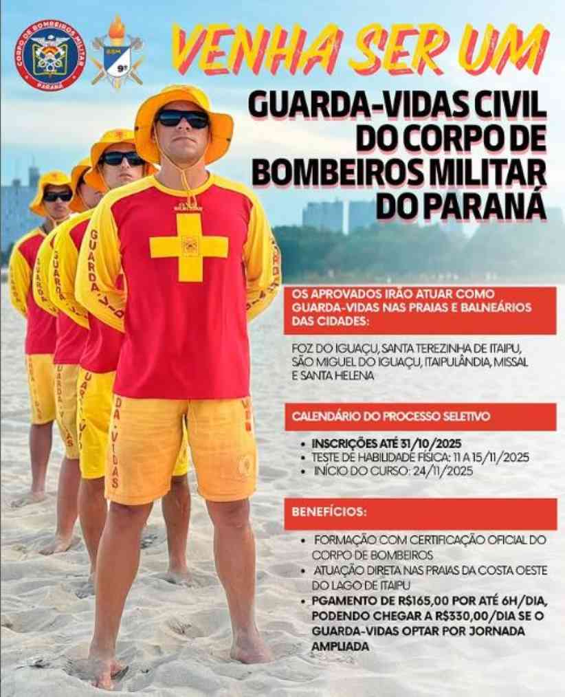 O Corpo de Bombeiros Militar do Paraná em Foz do Iguaçu abriu inscrições para o curso para formação de guarda-vidas civil voluntário. São 30 vagas.