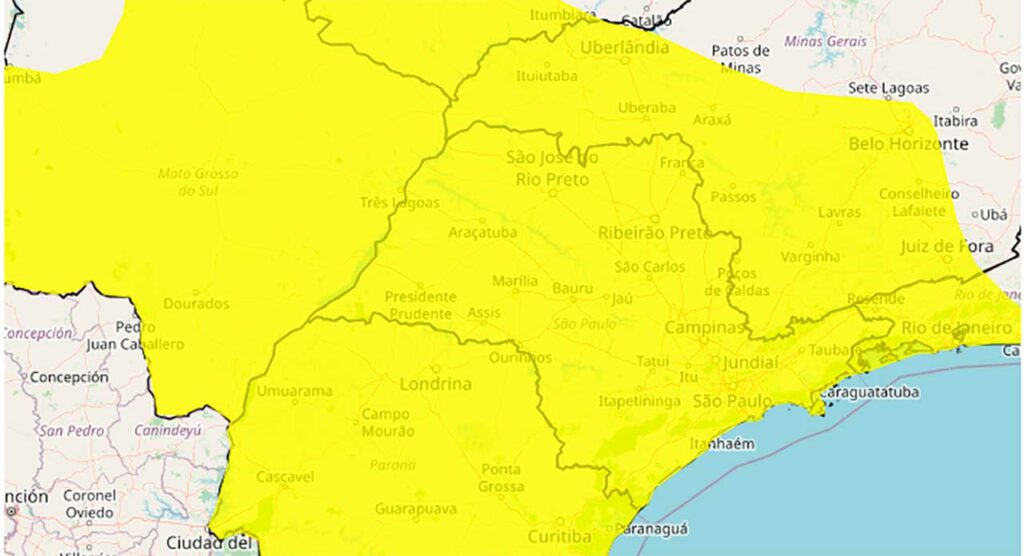 Segundo o instituto, há baixo risco de corte de energia elétrica, queda de galhos de árvores, alagamentos e descargas elétricas. Foz do Iguaçu é apenas um dos municípios presentes na faixa do alerta, que contempla todo o estado do Paraná e São Paulo, além de parte dos territórios do Mato Grosso do Sul, Goiás, Minas Gerais e Rio de Janeiro.