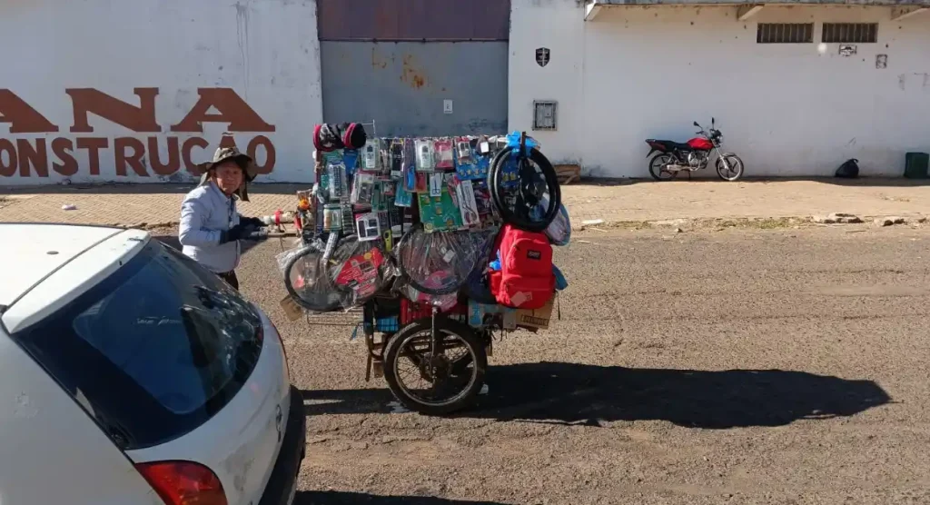 O vendedor carrega sua mercadoria num carrinho de mão modificado, transformado em uma loja sobre rodas, sortido com diversos itens como câmaras de ar, pneus dobráveis, mochilas e outros componentes de bicicleta e mochilas.