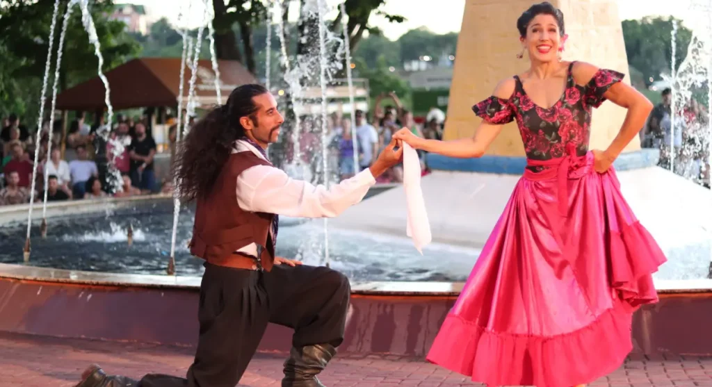 Ademais, essa mesma companhia conduz apresentações que conectam diferentes expressões culturais da região. Entre os destaques estão encenações que resgatam, sobretudo, lendas locais, como a história de Naipi e Tarobá, além de coreografias que percorrem influências europeias e tradições populares da América do Sul. Além disso, os espetáculos reúnem ritmos como samba, frevo, tango e polca paraguaia, simbolizando a integração entre os três países.