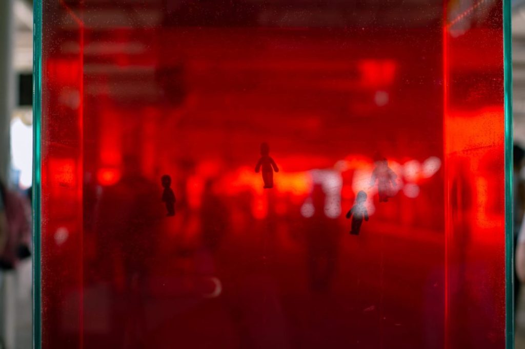A ação propõe um encontro: alguém de macacão vermelho, ouvindo histórias de corações partidos. Conforme os relatos chegam, o artista borda em ponto-cruz um coração anatômico em tamanho real, simbolizando as histórias ouvidas. Os passantes, que narram as histórias, retiram dos bolsos do macacão bonecos ligados a um fio de chumbo, que deverão ser colocados no aquário.