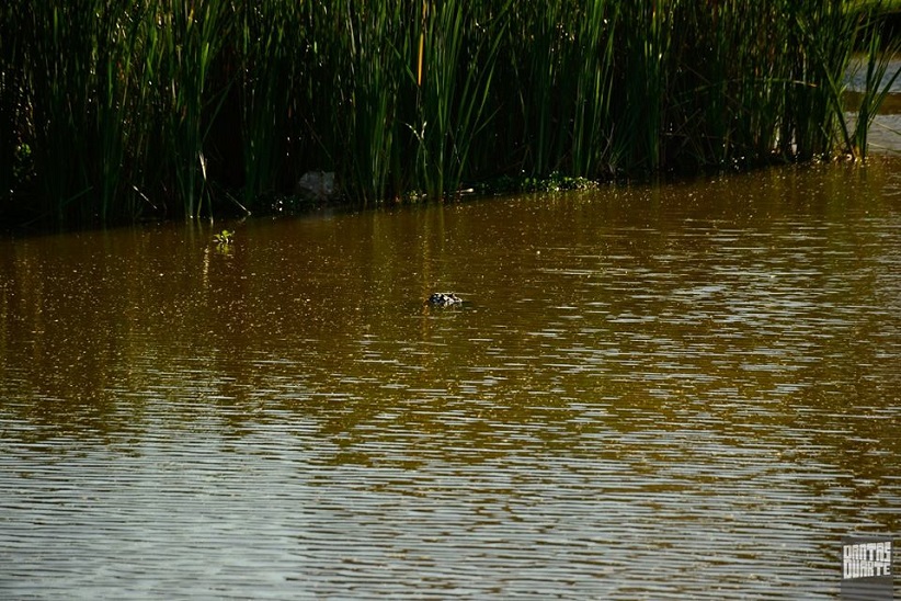 Nas fotos 3 e 4, um aviso sobre o jacaré-do-papo-amarelo que habita o lago, e o próprio jacaré com a cabeça pra fora d’água!