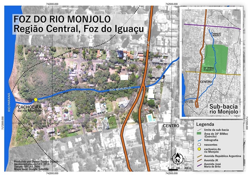 Após o trecho de canalização, o rio encontra outra área verde, na baixada da Avenida JK (fundos da Unifoz) e cai por uma das mais belas cachoeiras dessa cidade, fétido e poluído, encontrando o Rio Paraná. Na foto 14 é possível ver onde a JK cruza o trecho canalizado do Rio Monjolo.