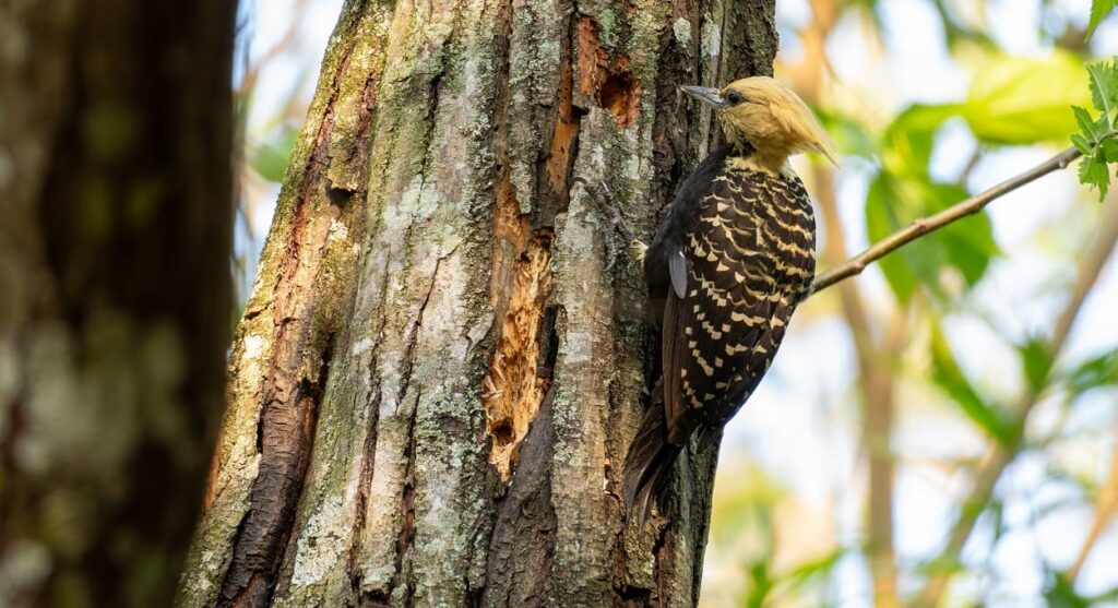 Nas imagens feitas por Labanca na primeira visita à área arborizada, é possível ver como o pica-pau usa a cauda como uma espécie de terceira pata para aumentar o apoio do corpo enquanto desfere as bicadas contra o tronco.
