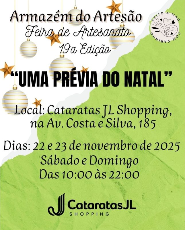 O fim de semana em Foz do Iguaçu será recheado de arte e artesanato. A 19.ª edição da Feira de Artesanato Armazém do Artesão ocorrerá nos dias 22 e 23 de novembro no Cataratas JL Shopping.