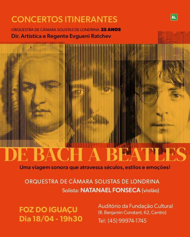 O destaque do tour é o concerto “De Bach a Beatles”, que será apresentado nos teatros gratuitamente e propõe uma viagem por diferentes épocas da história da música, evidenciando a transformação de estilos e linguagens ao longo do tempo. Em Foz do Iguaçu, a apresentação será realizada no dia 18 de abril (sábado) às 19h30, no Auditório da Fundação Cultural (Rua Benjamin Constant, 62) com entrada gratuita.