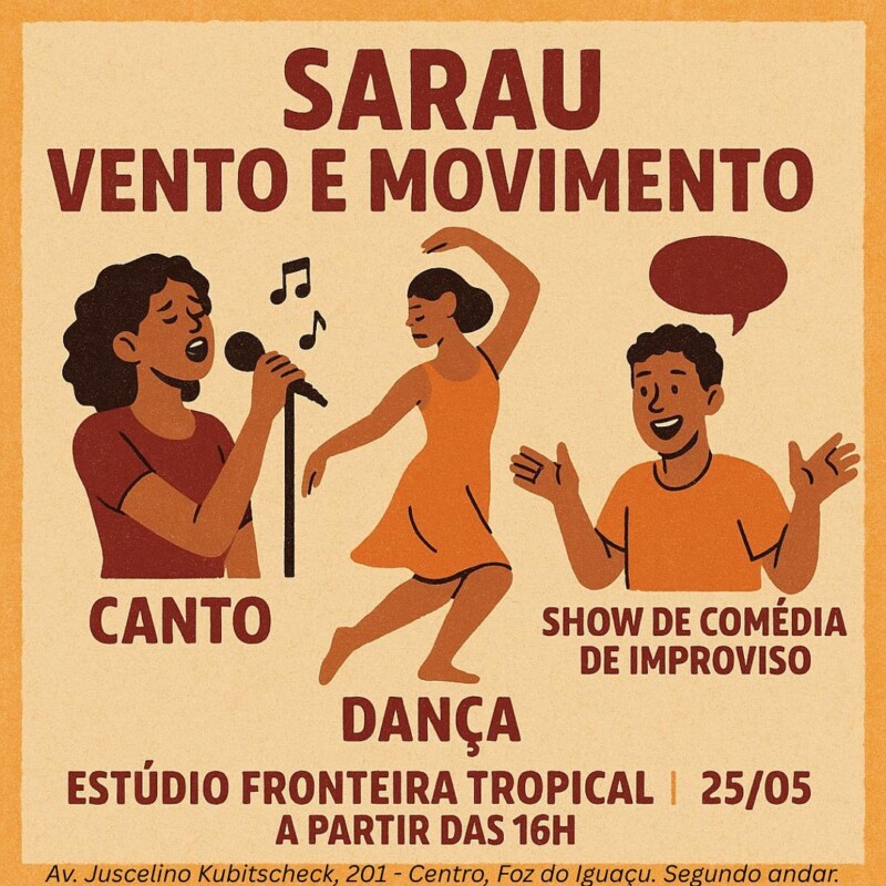 O estúdio de artes Frontera Tropical realiza seu primeiro sarau, intitulado Vento e Movimento. O evento será no domingo, dia 25, a partir das 16h, e gratuito.