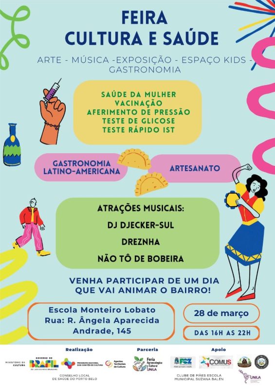 No dia 28 de março, na Escola Monteiro Lobato (Rua Ângela Aparecida de Andrade, 145), no bairro do Porto Belo, região norte de Foz do Iguaçu, ocorrerá a Feira Cultura e Saúde. Uma iniciativa do Conselho Local de Saúde do Porto Belo, de uma das Agentes Territoriais de Cultura, e em parceria com a Feira Agroecológica e Cultural, e apoio da Pró-Reitoria de Extensão da UNILA, Associação de Moradores do Porto Belo, Clube de Mães Empreendedoras, Escola Municipal Suzana Balen, Conselho Municipal de Saúde e Secretaria Municipal de Saúde.