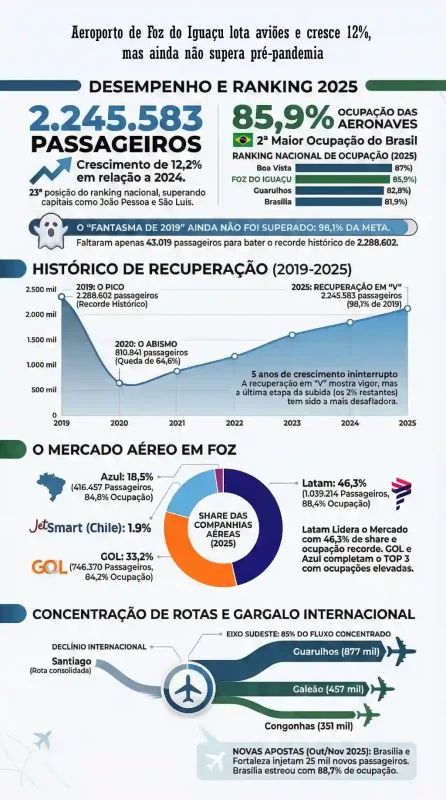 Contudo, os números seguem abaixo do teto pré-pandemia. Em 2019, o aeroporto estabeleceu seu recorde histórico com 2.288.602 passageiros. Ao fechar 2025, Foz atingiu 98,1% daquela marca. Faltaram pouco mais de 43 mil passageiros para que o “fantasma” de 2020 fosse finalmente superado.
