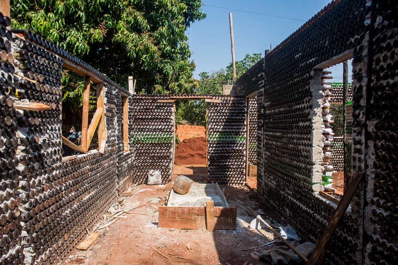 A casa de 70 metros quadrados começou a ser construída em abril deste ano. Já são 11 mil garrafas utilizadas, doadas pela comunidade ou retirada das ruas pelo casal. Quando a moradia ficar pronta, serão 20 mil garrafas de vidro.
