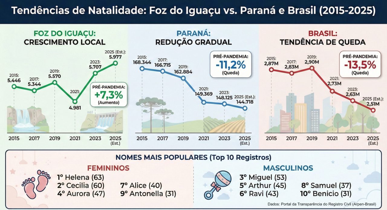 Foz do Iguaçu celebra o recorde de nascimentos, enquanto Paraná e Brasil ainda tentam retomar os patamares anteriores aos da pandemia. O comparativo com o período pré-pandêmico mostra que o Paraná registra retração de 11,2%, e o Brasil acumula queda de 13,5%.