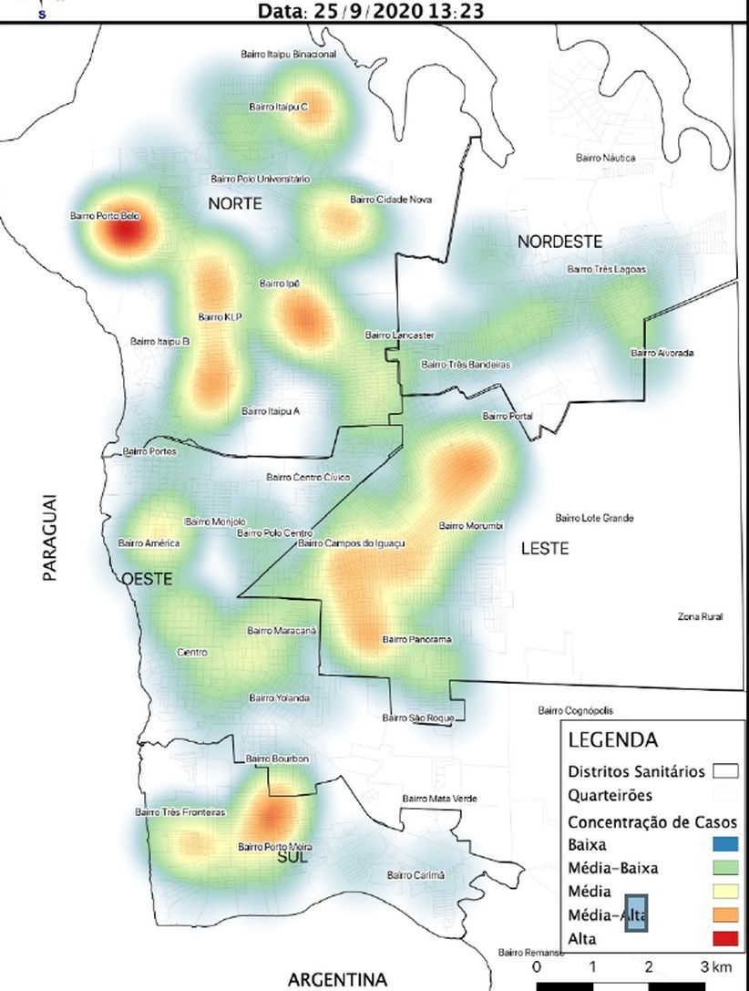 No “mapa do calor” da Vigilância Sanitária de Foz, vê-se que a região Norte é a de maior risco, em especial no Porto Belo.