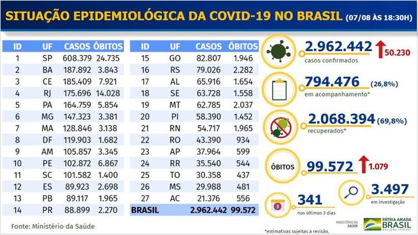 O número acumulado de casos atingiu 2.962.442. Desde ontem, foram 50.230 novos casos informados pelas secretarias de saúde, mesma situação das mortes, achatamento está longe.