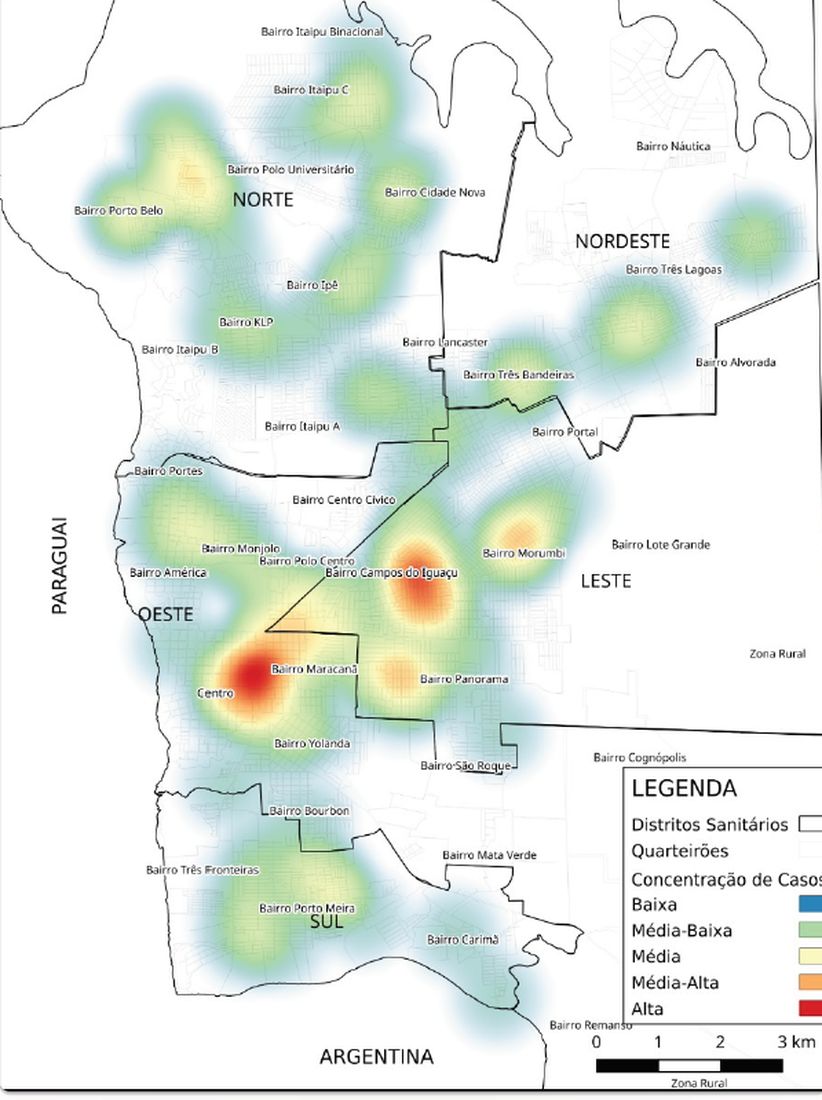 O mapa do calor mostra que a concentração de casos está entre média e alta no centro da cidade e nos bairros Maracanã, Campos do Iguaçu, Morumbi e Panorama.
