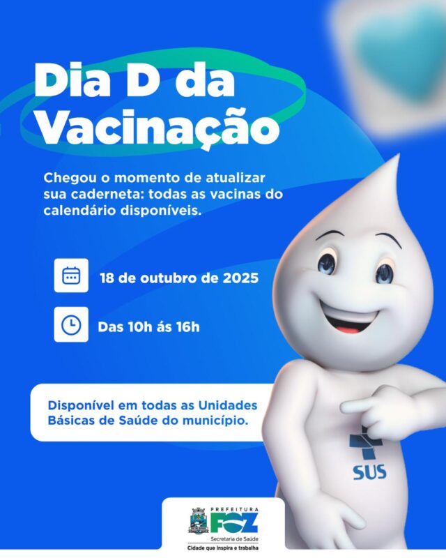 Equipes da Secretaria Municipal de Saúde estarão mobilizadas neste sábado, 18, das 10h às 16h, para o Dia D da Multivacinação em Foz do Iguaçu. A ação acontecerá nas 28 unidades básicas de saúde (UBSs) e nos shoppings Catuaí Palladium e JL.