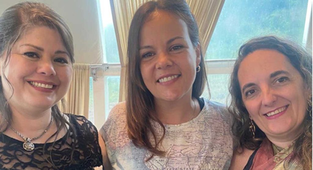 Da esquerda para a direita, a paraguaia Luísa Davalos, eu (Isabela) e a pesquisadora argentina Lila Voeffrey durante passeio de catamarã, representando a confluência das águas que banham Argentina, Paraguai e Brasil.