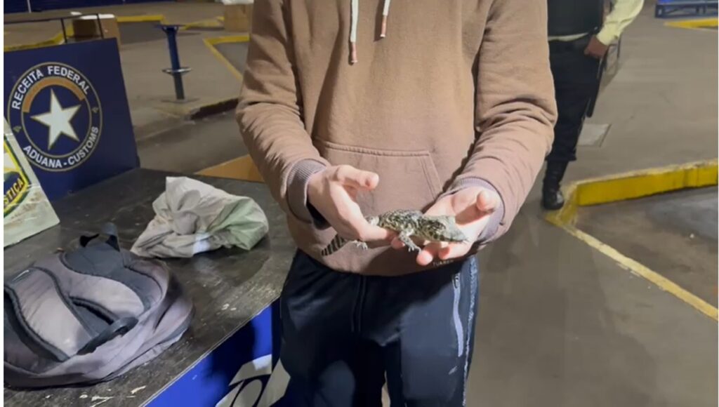 Um brasileiro foi interceptado na noite deste sábado, 18, na Ponte Internacional da Amizade, com 10 lagartixas-de-crista, 12 jacarés, uma sucuri e uma píton.