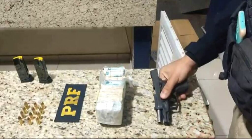 “Dentro da bolsa havia uma pistola calibre 9mm carregada com nove munições e um carregador vazio”, noticiou a Polícia Rodoviária Federal. E também um pacote com R$ 33.750 em dinheiro, dentro do porta-luvas.