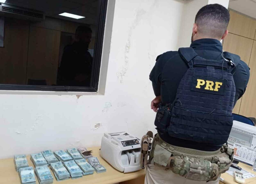 “Durante análises nos sistemas de registros, verificou-se que o passageiro responde a um processo criminal por estelionato”, informou a PRF. A equipe empreendeu buscas no interior do carro e encontrou grande quantia em espécie, sendo: