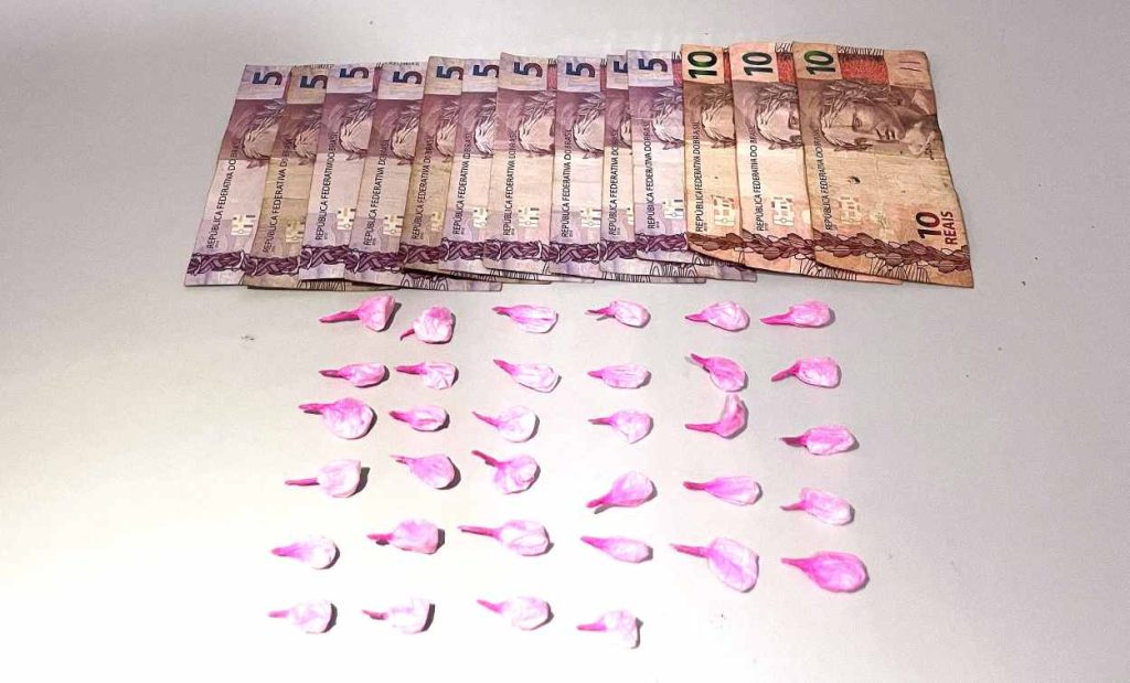Feita a revista pessoal, foi localizado o pó, além do dinheiro trocado. Trata-se de “característica comum da prática de tráfico de drogas”, informou o 14.º BPM.