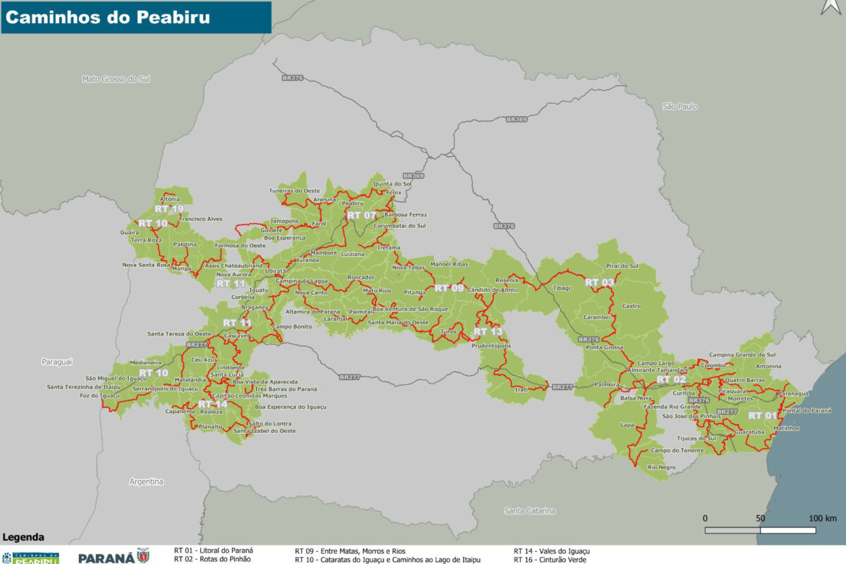 O Caminhos do Peabiru compõe uma rede de trilhas ancestrais com mais de 3 mil anos, conectando o Oceano Atlântico ao Pacífico e passando por Brasil, Paraguai, Bolívia e Peru. No território nacional, corta o Paraná de Leste a Oeste e inclui trilhas de longo curso, rotas aquáticas, percursos de montanhismo e caminhadas.