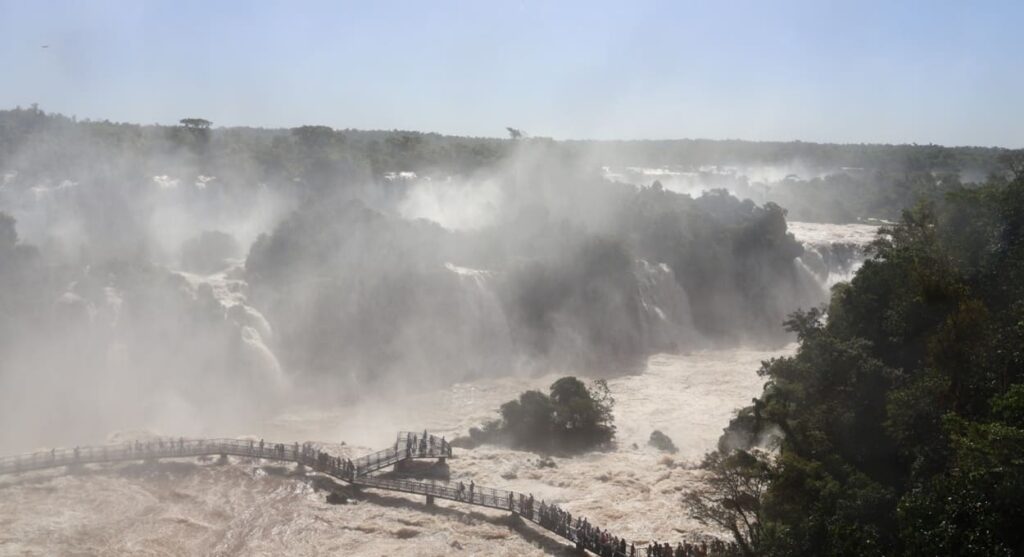 Mesmo com a cheia do Rio Iguaçu, todas as trilhas e mirantes estão abertos no Parque Nacional do Iguaçu, lado brasileiro das Cataratas.