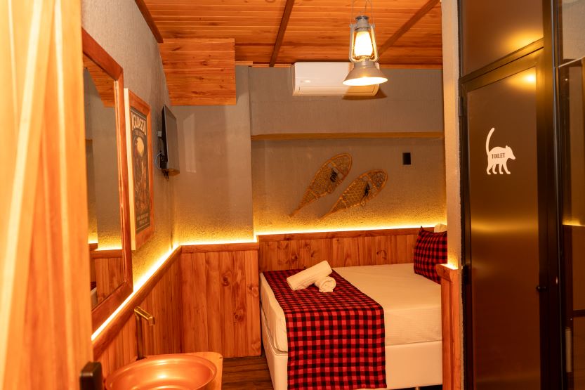 A hospedagem temática, além das cápsulas, conta com quartos e suítes para família ou casal. Confortáveis e privativas, elas lembram cabanas em montanhas, e convidam o hóspede a imaginar-se em Yellowstone, parque nacional nos Estados Unidos, um dos mais antigos do mundo.