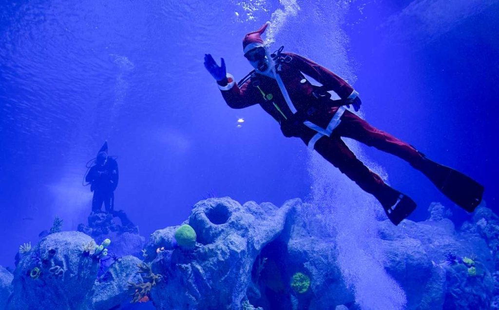 Aproveitando o ensejo do Natal, o mergulhador usará os trajes de Papai Noel para interagir com os visitantes e fazer a alegria das crianças. No tanque de água salgada com 5m80 de profundidade, ele encontra tubarão-lixa, garoupas, raias e pequenos peixes.
